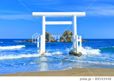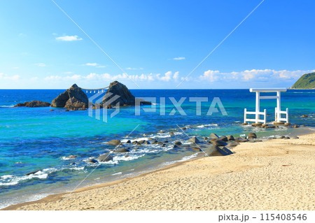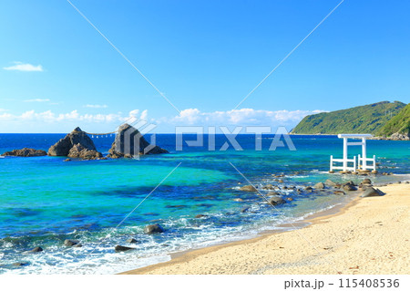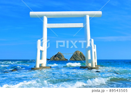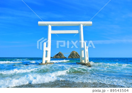 【福岡県】晴天下の桜井二見ヶ浦の夫婦岩と白鳥居