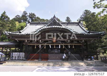 春の茨城県つくば市の筑波山神社の拝殿を見る