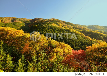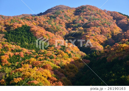 快晴の下、色鮮やかに紅葉した茨城県の秋の宝篋山(ほうきょうさん)
