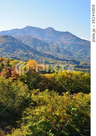 茨城県の秋の快晴の宝篋山(ほうきょうさん)の山頂から望む、筑波山