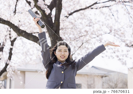 卒業証書筒を持って桜を眺める小学6年生 卒業イメージ