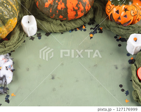 Halloween green frame background flatlay with colorful pumpkins and confetti
