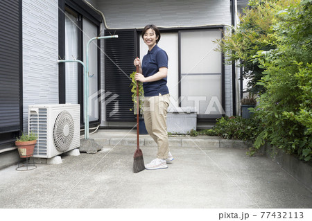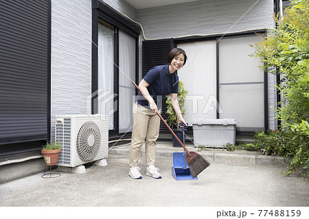 駐車場の掃き掃除をするハウスクリーニング の女性