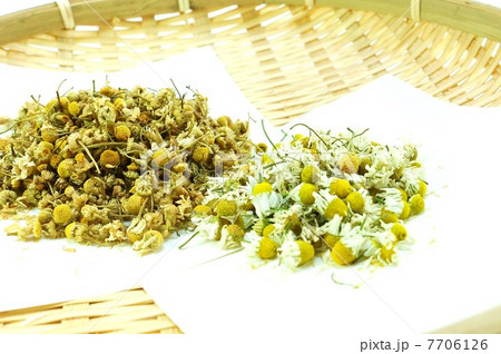 アンチエイジングハーブ・笊に新旧のカモミール茶・横位置