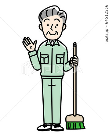 ビル清掃イメージ モップで床を拭くシニアの男性クリーニングスタッフ