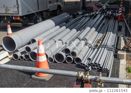 建設現場の資材置場 管路材とクレーン
