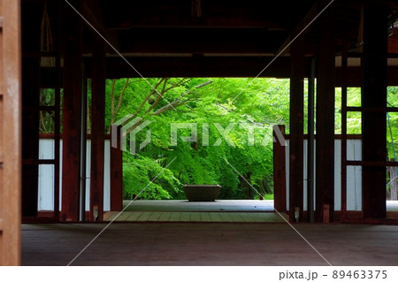 開け広げらえた社殿越しに見える鮮やかな新緑のモミジ(大分県中津市)