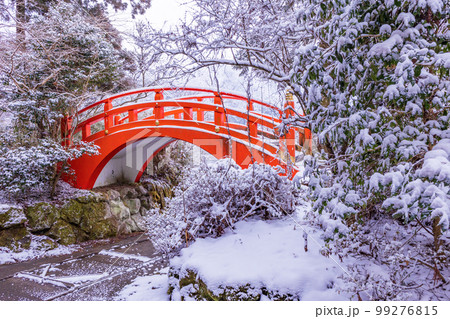 (神奈川県)降雪のあった、箱根神社 船庫に架かる朱色の橋