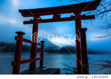 東雲の芦ノ湖と箱根神社赤鳥居