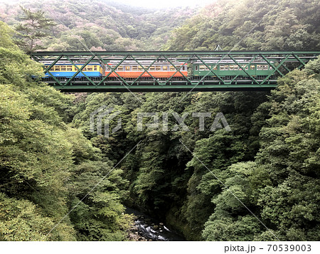 出山の鉄橋を渡る箱根登山鉄道旧塗装3連