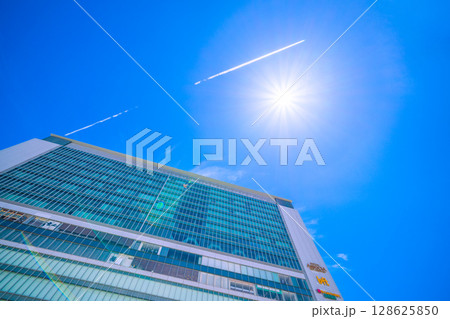 日本の横浜都市景観 新横浜駅前のビル群や飛行機雲、太陽などを望む。新時代へ=7月19日