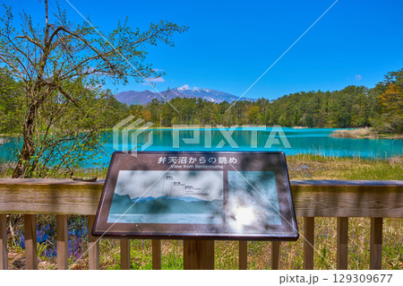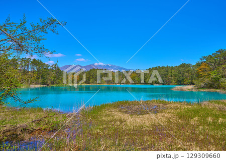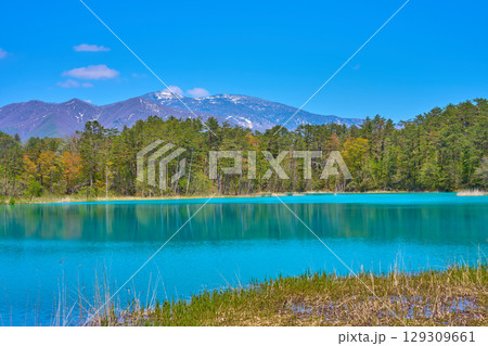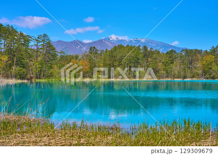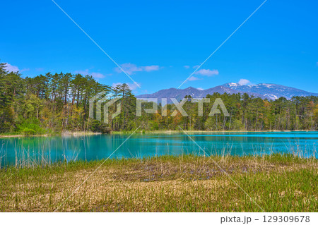 新緑の福島県 裏磐梯高原の弁天沼と残雪の西吾妻山、西大巓