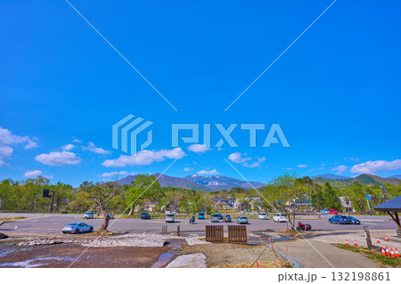 春の福島県耶麻郡北塩原村の裏磐梯ビジターセンター付近から駐車場と北側の山々(簗部山,西大巓など)