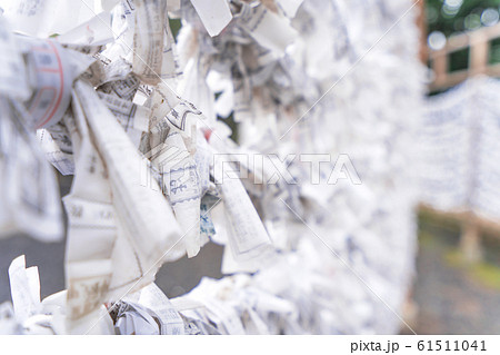 Saga, Japan - Nov. 12, 2018: Japanese random fortune telling paper (Omikuji) folded and tied on rope wires (Omikuji kake) in traditional temple, concept of bringing blessing.