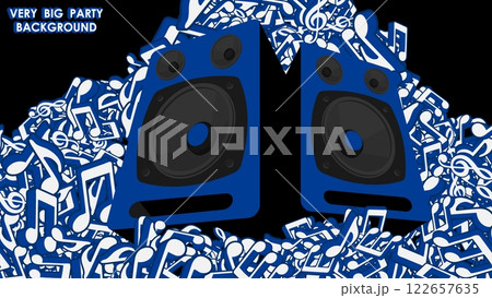 Huge music speakers with low frequency and bass generator stand on pile of musical notes. Notes piled up in big heap. Vector banner for advertising of music party, disco or artistic concert