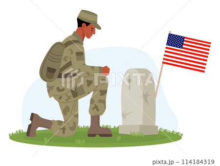 Military black ethnic soldier on one knee in front of grave with American flag. Memorial Day. Veterans Military Cemetery. Vector illustration