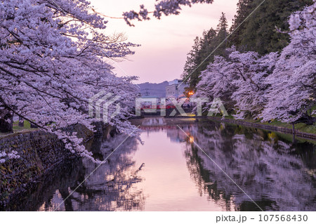 山形県米沢市 春のライトアップされた米沢城址のお堀と満開の桜