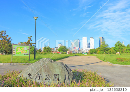 愛知県名古屋市、米野公園と名古屋駅前超高層ビル群の風景