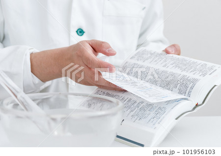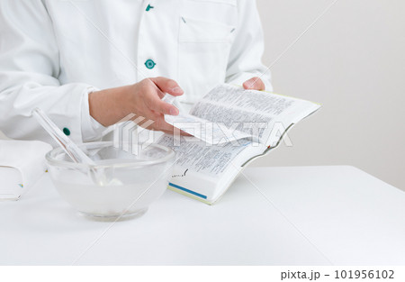 粉砕調剤とハンドブックで調べる薬剤師。乳棒と乳鉢が置かれている