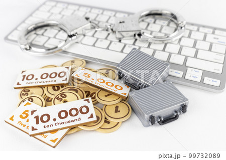 オモチャのお金とアタッシュケースと手錠とキーボード。マネーロンダリングのイメージ