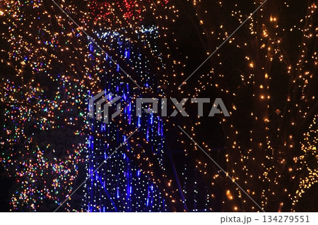 流れる「滝」をさらに包む込む大木のデコレーション 町民の森公園イルミネーション2025(12.7)