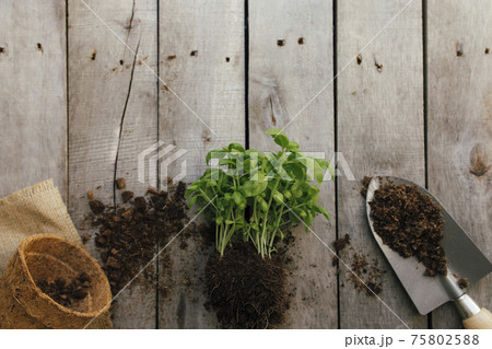 Gardening concept. Green basil in flowerpot on wooden background. Garden hobby