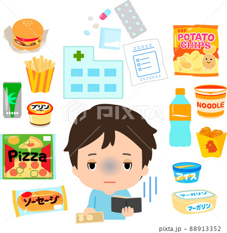 不健康な食品と医療費にお金を払う男性