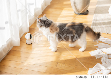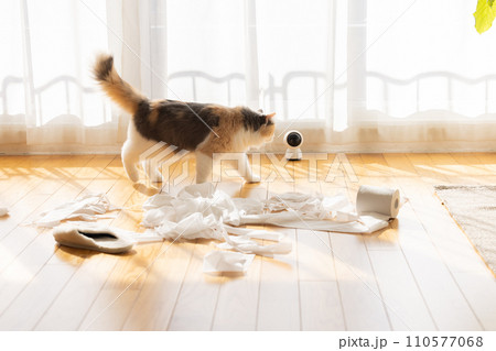トイレットペーパーでいたずらをする猫