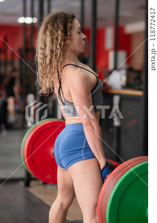 Slender girl trains muscles of arms and back using barbell and differentiated weighting in gym