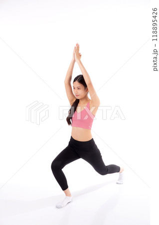 Portrait young asian woman in sportswear doing practice yoga for stretch hands isolated.
