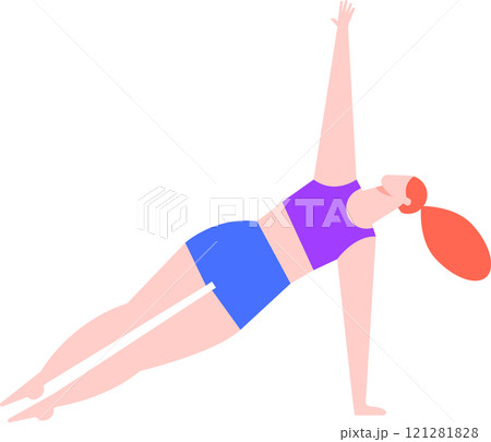 Stylized illustration depicts a woman with blue hair holding a yoga boat pose, showcasing balance, strength, and mindfulness in her practice