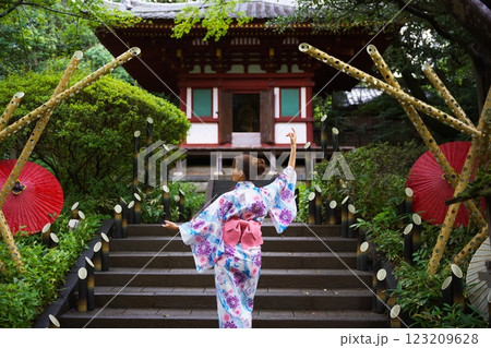 Woman in Kimono Gracefully Dancing on Temple Steps