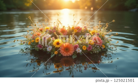 Floating floral wreath with wildflowers on water at sunset reflecting sunlight