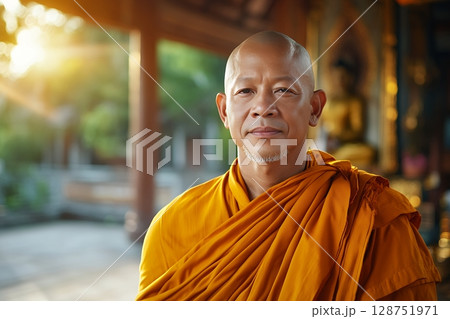 Serene Buddhist monk in traditional saffron robes, calmly gazing at the camera in a peaceful temple setting