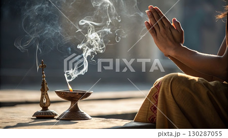 Peaceful Prayer Ritual with Diya and Incense Smoke