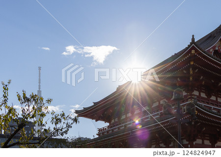 Bright sunlight illuminates the traditional Buddhist temple Senso-ji in Tokyo