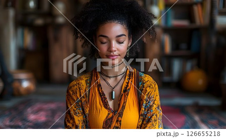 Young woman 25 years old, draped in a beautifully patterned scarf, appears contemplative at a community gathering in Afghanistan. Her expression reflects a mix of strength and serenity. Generative AI