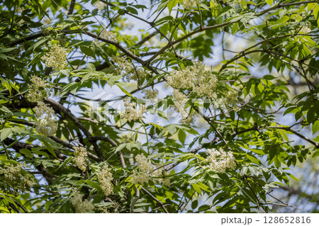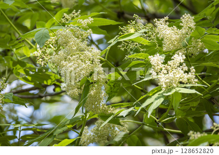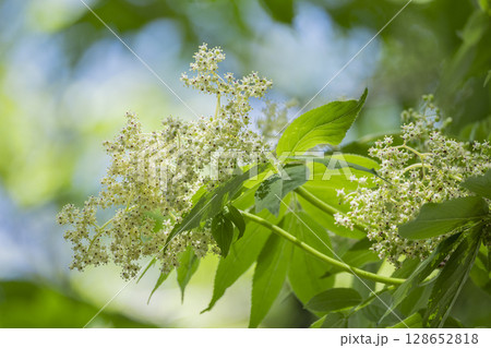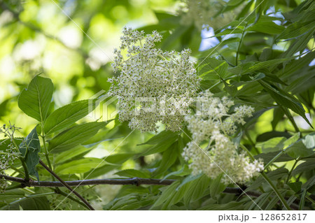 早春の雑木林で満開の花を咲かせるニワトコ