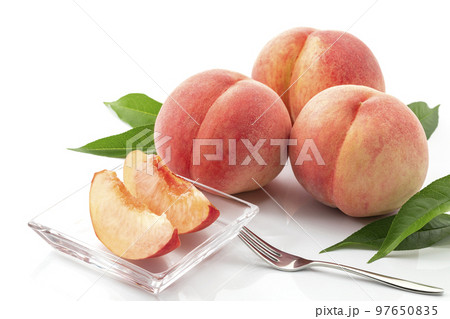 葉を添えた白バックの桃_夏が旬の果物