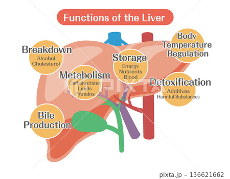 肝臓の働きの解説図(代謝・解毒・胆汁生成)