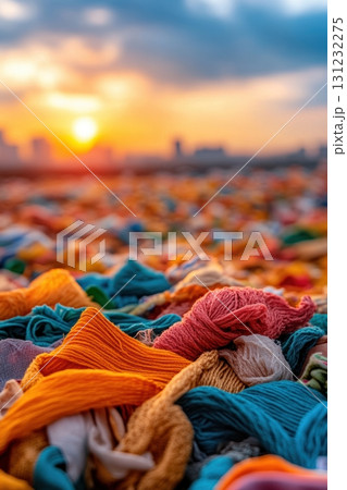 Vibrant sunset hues illuminate a massive pile of colorful, textured fabrics, creating a captivating scene of sunset textiles