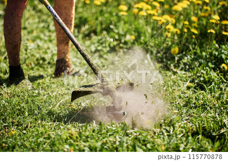 Line trimmer drum head came into contact with molehills, causing cloud of dust over lawn.