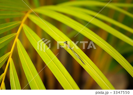 コガネタケヤシと思われる植物の葉に止まるイトトンボ