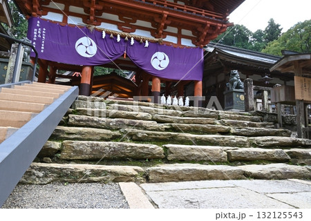 厳かな丹生都比売神社の桜門を見上げる