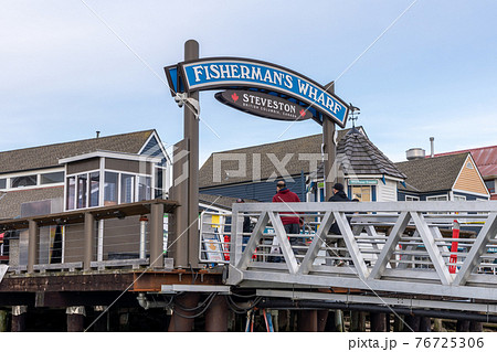 Steveston Harbour Fisherman's Wharf. People wearing face mask during covid-19 pandemic period. Richmond, BC, Canada.