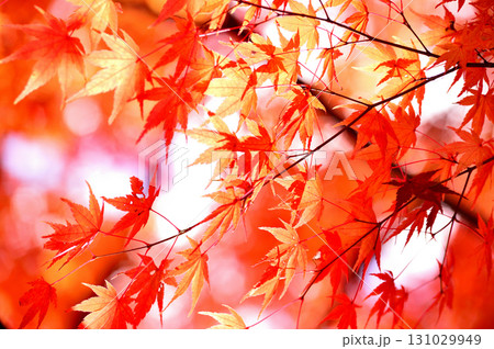 真っ赤に紅葉した美しいモミジに陽射しが差し込む光景