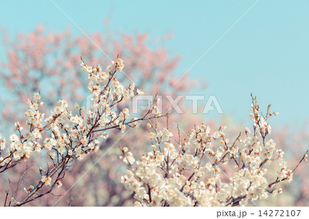 白い冬至梅(トウジバイ)と赤い梅の背景