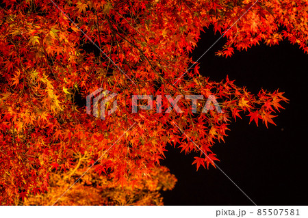 ライトアップされた紅葉、光り輝くモミジ、秋夜の風景、鮮やかな色合いの紅葉、