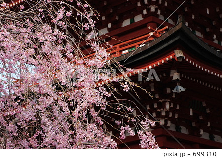 青森県弘前市 花吹雪の金剛山最勝院五重の塔としだれ桜