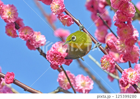 満開の紅梅にメジロさん ( 春イメージ )( 春うららかイメージ )